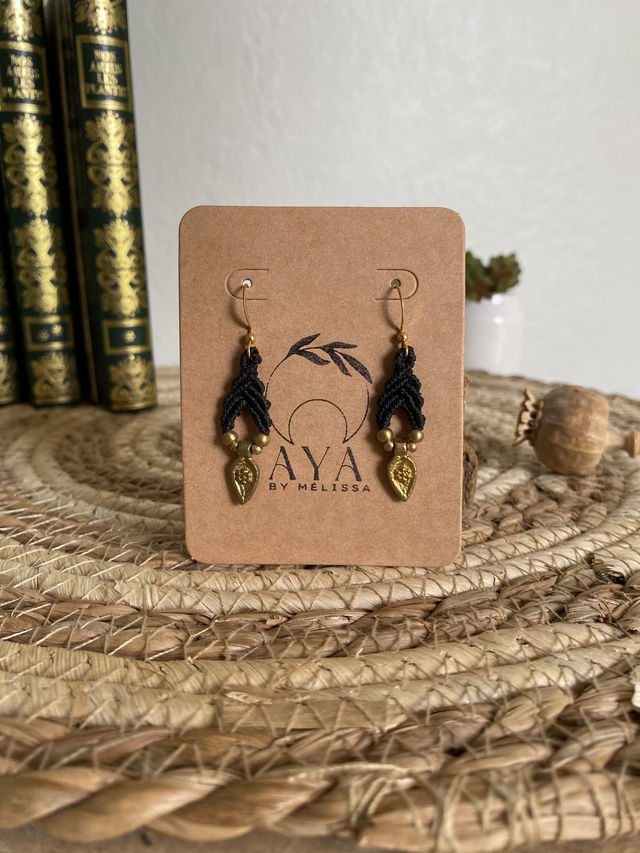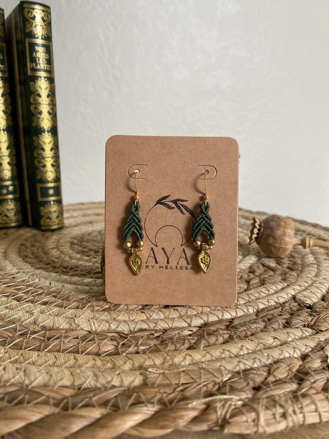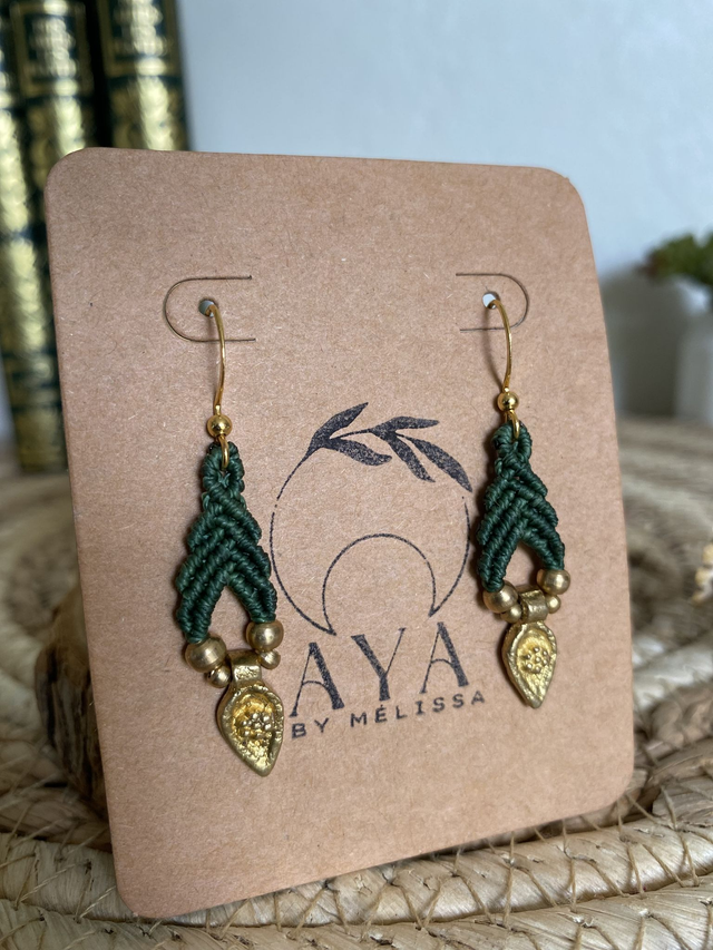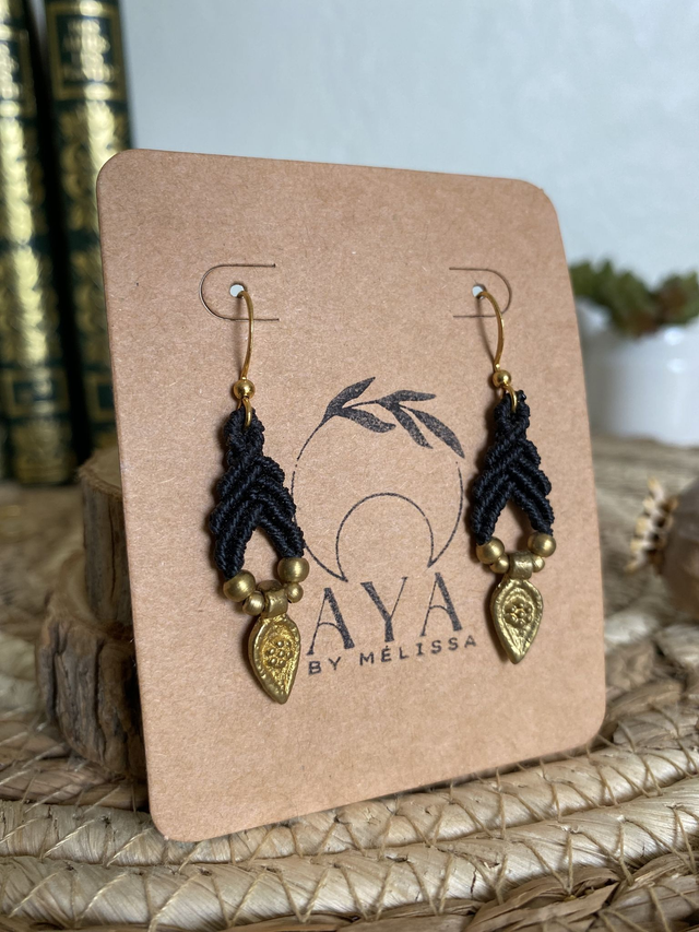 Des boucles d’oreilles légères, tissées à la main en micro-macramé et ornées d’une breloque en laiton, pour un style lumineux, bohème et original.
