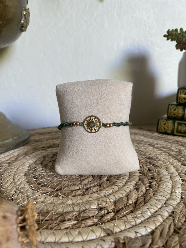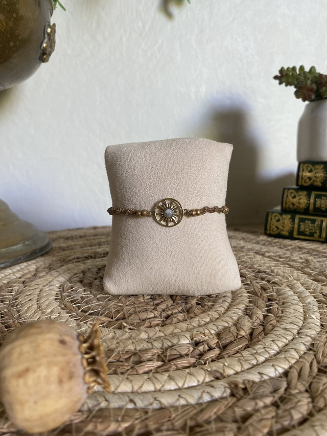 Un bracelet raffiné qui met en valeur une pierre de Lune, sertie dans un soleil en laiton.