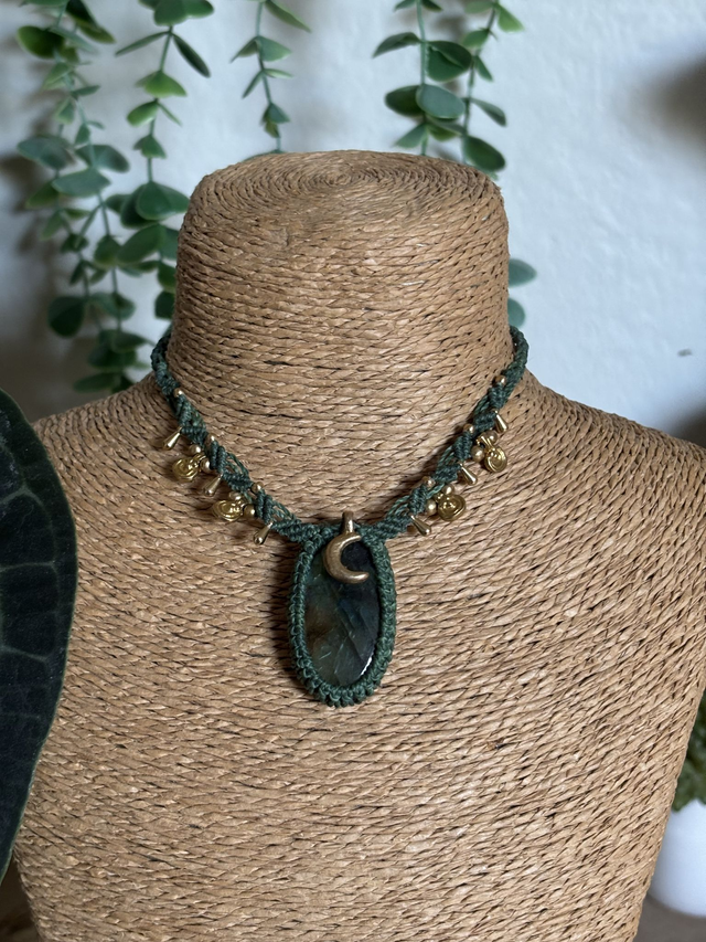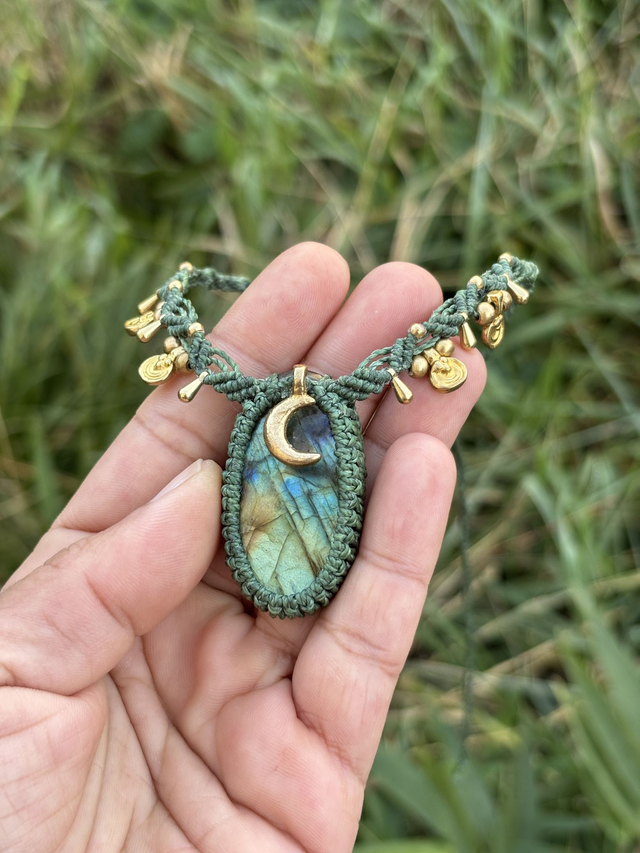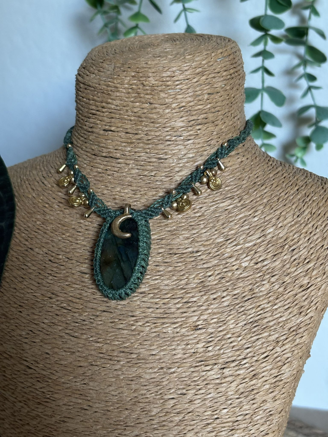 Ce bijou est composé d’une labradorite aux reflets changeants, sertie et tissée à la main en micro-macramé.