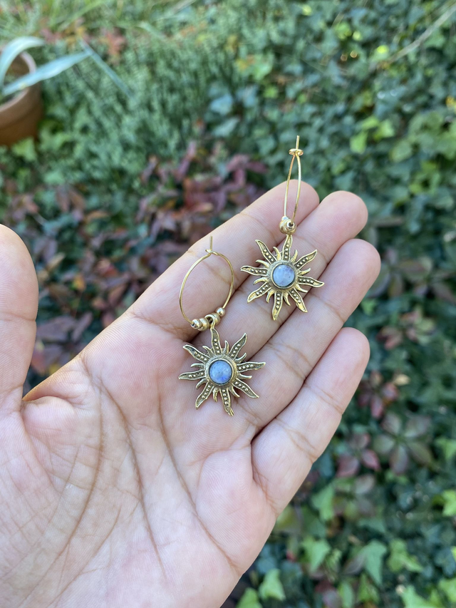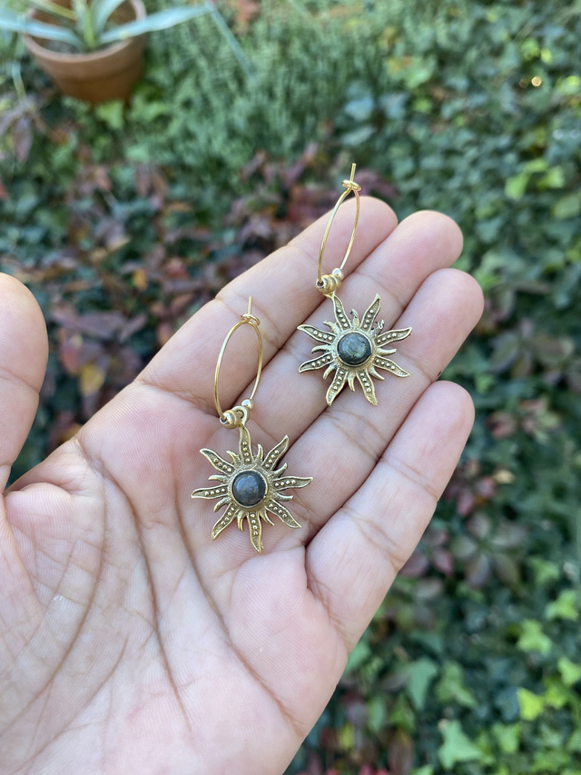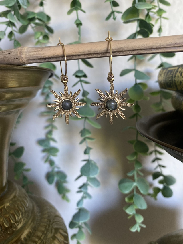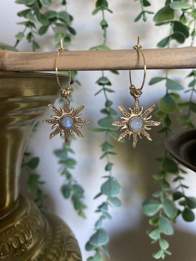 Des créoles dorées ornées d’une breloque en forme de soleil, avec une pierre naturelle sertie en son centre.