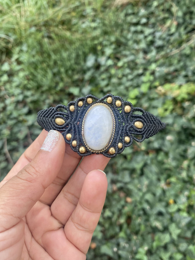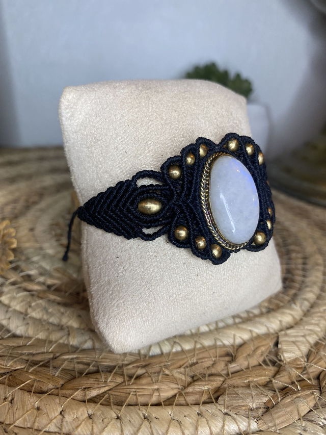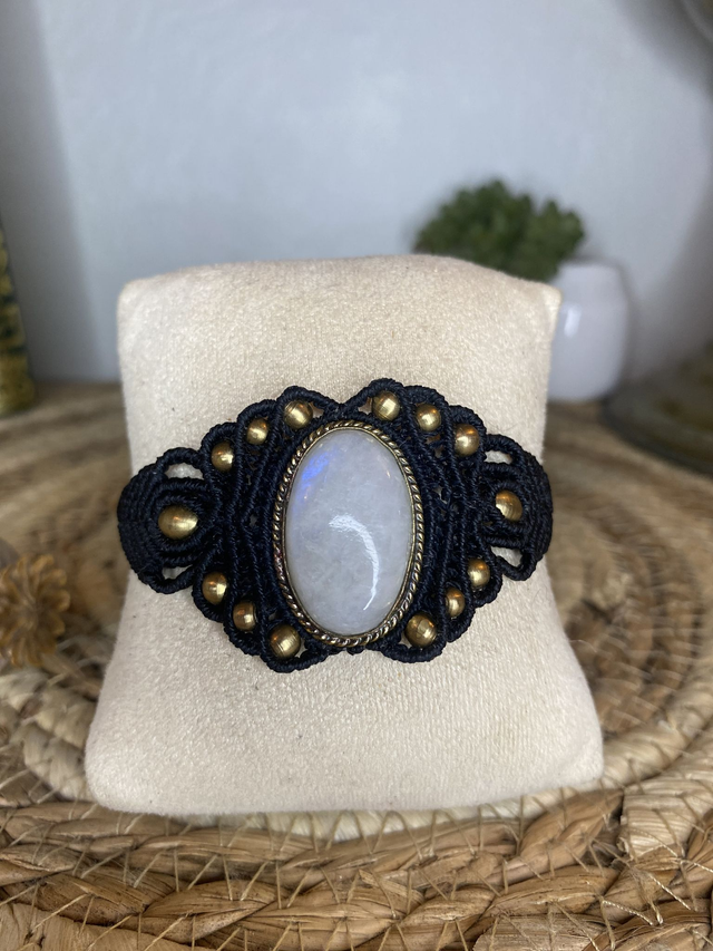 Manchette en micro-macramé, entièrement tissée à la main avec un fil noir profond et une pierre de lune délicatement sertie.